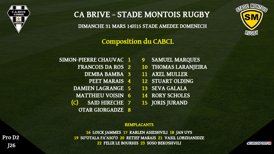 Pour cette réception, Brive change 4 joueurs. Simon-Pierre Chauvac retrouve la place de titulaire à gauche de la première ligne. Damien Lagrange est de retour en 2e ligne. Otar Giorgadze reprend le numéro 8, une première depuis la réception de Biarritz. Rory Scholes remplace Franck Romanet.