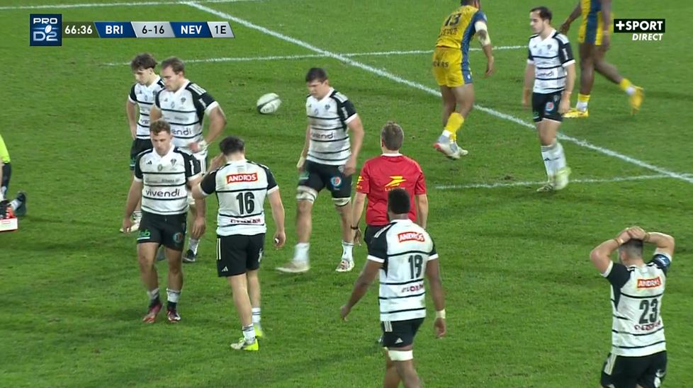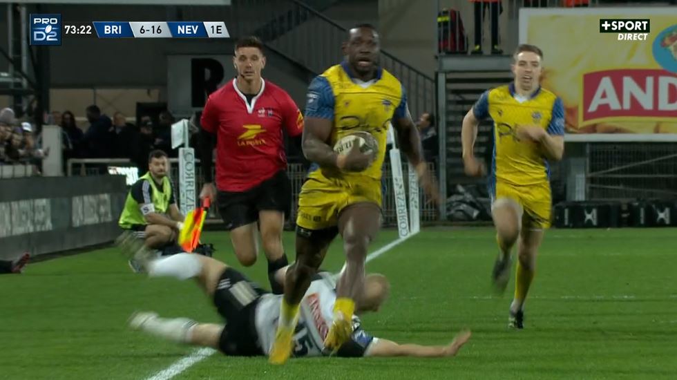 La bataille tactique. C'est quelque chose qui interroge depuis le début de saison : si Brive est contré dans l'axe, est contré dans son jeu d'avants, c'est quoi le plan B ? Plus les matchs passent, moins on arrive à savoir qu'est ce que pourrait être ce plan B. Sur ce match, Xavier Péméja a gagné son match tactique face à Pierre-Henry Broncan. Le staff neversois a clairement identifié les forces et faiblesses du jeu briviste. Un jeu briviste basé sur le jeu dans l'axe, tant en attaque qu'en défense. Sauf que voilà, si vous vous concentrez trop dans l'axe, vos ailes vont devoir être décisives. Nevers n'a pas attaqué dans l'axe pour attaquer dans l'axe. Ils ont attaqué dans l'axe pour libérer les ailes. Et là, Christian Ambadiang s'est régalé des boulevards : 123 mètres parcours, 6 défenseurs battus, 2 franchissements. L'essai de Nevers vient d'un duel 1 contre 1 à jouer sur une aile bien dégarnie. En attaque, Brive n'était pas armé pour jouer dans l'axe sur ce match. L'équipe manquait de poids lourds pour porter cette balle et avancer dans l'axe. Tactiquement, Brive est assez visible par l'adversaire mais est ce qu'il peut faire autre chose avec les joueurs/staff qu'il a ?