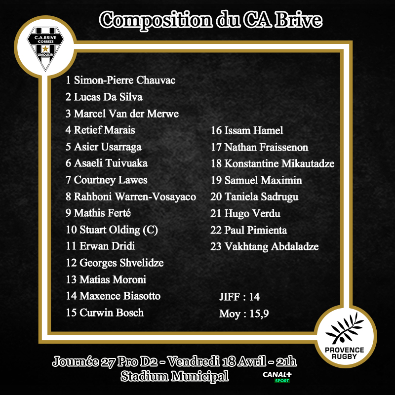 Pour cette réception, Brive n'effectue que des retouches à l'équipe victorieuse à Agen la semaine dernière. Le pack reste inchangé tandis que Matias Moroni, de retour de blessure, prend place au centre, à côté de Georges Shvelidze. Maxence Biasotto sera ailier sur ce match face à Provence. C'est Vakhtang Abdaladze qui remplace sur le banc Francisco Coria Marchetti, suspendu.
