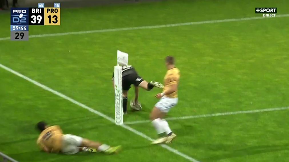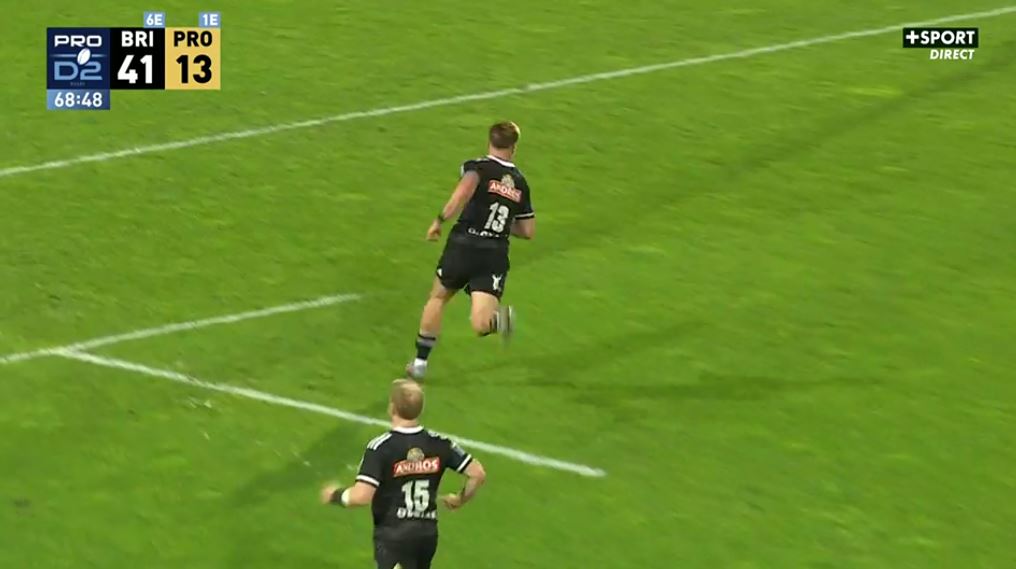 Après avoir plus que tenu tête aux brivistes pendant un peu moins de 30 minutes, Provence est en train d'exploser dans ces dernières minutes de la première partie. Jouer c'est bien mais ne pas prendre trop de risques, c'est encore mieux. Sauf que là, Provence n'assure pas une passe vers les extérieurs, Lefranc intercepte et plus personne ne le reverra (27-10, 37').