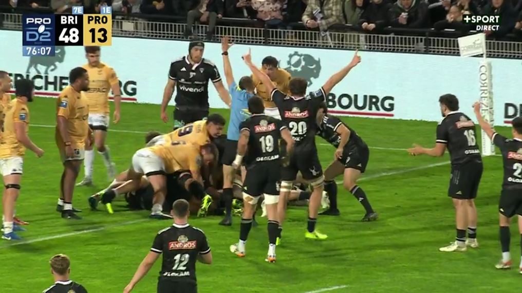 Sous les regards de plusieurs ex-joueurs comme Tom Raffy, Léo Carbonneau, Loan Lavergne, Matthieu Voisin ou bien Joris Jurand, les brivistes régalent ce soir et la fête n'est pas encore totalement finie. A la suite d'une touche, les avants cherchent à y aller en force mais ils sont stoppés devant la ligne. Courtney Lawes prend le ballon et aplatit dans l'en-but (53-13, 77').
