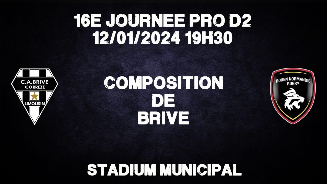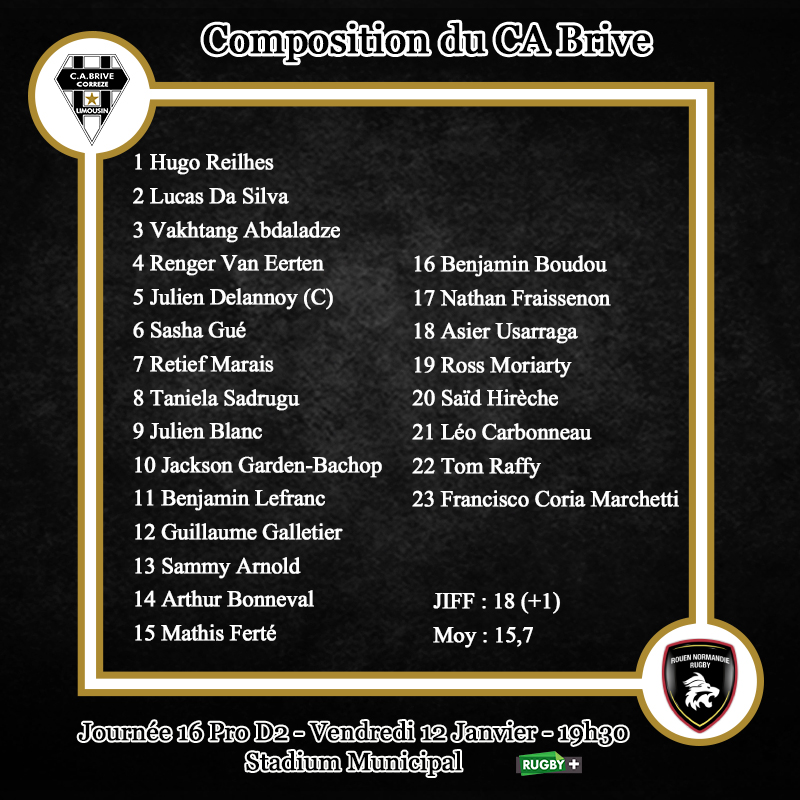 Pour cette réception, Brive en profite pour combler une partie de son retard en JIFF. La première ligne reste la même qu'à Biarritz. Renger Van Eerten commence en 2e ligne. Absent la semaine dernière, Taniela Sadrugu débute en numéro 8. Julien Blanc retrouve le poste de titulaire à la mêlée. Benjamin Lefranc et Arthur Bonneval sont les ailiers titulaires, Mathis Ferté glissant à l'arrière.