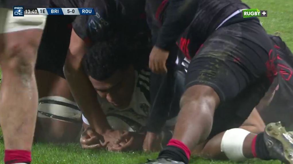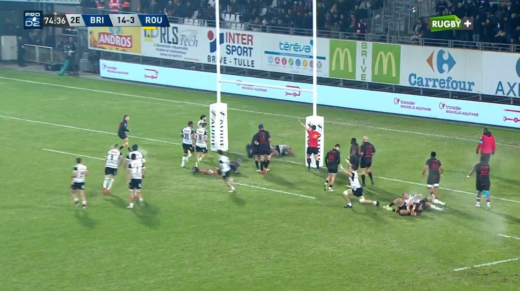 Il ne fait pas bien chaud au Stadium pour cette rencontre et il faut espérer ne pas prendre froid durant ce match. Le début de match est à l'avantage des rouennais qui tiennent le ballon mais sans réellement faire des différences. Il tombe sur une défense solide de Brive qui se permet même d'avancer et de mettre sous pression leurs adversaires. Mais cette situation est valable également dans l'autre sens où Brive ne trouve pas d'espaces dans une défense qui plaque bien et met rapidement au sol. La mêlée briviste a du mal en ce début de rencontre, sanctionnée à plusieurs reprises. Sur une pénalité, cela offre une belle munition d'attaque à Rouen dans les 22 mètres. Mais sur un ruck, le ballon est mal protégé et Julien Blanc en profite pour lancer le contre et ainsi inverser la pression. Brive s'installe dans le camp adverse et arrive enfin à trouver des espaces au large. Les 3/4 tentent de mettre de la vitesse, Mathis Ferté allonge vers Retief Marais, resté sur la touche. Le 3e ligne fixe deux joueurs avant de passer à Taniela Sadrugu qui a le champ libre. Le fidjien fait parler sa vitesse et sa puissance sur 40 mètres. Il est repris devant la ligne. Ferté tente d'y aller mais il est repris in-extremis par la défense. Sadrugu y revient une seconde fois, résiste à trois plaquages et termine derrière la ligne (7-0, 15').
