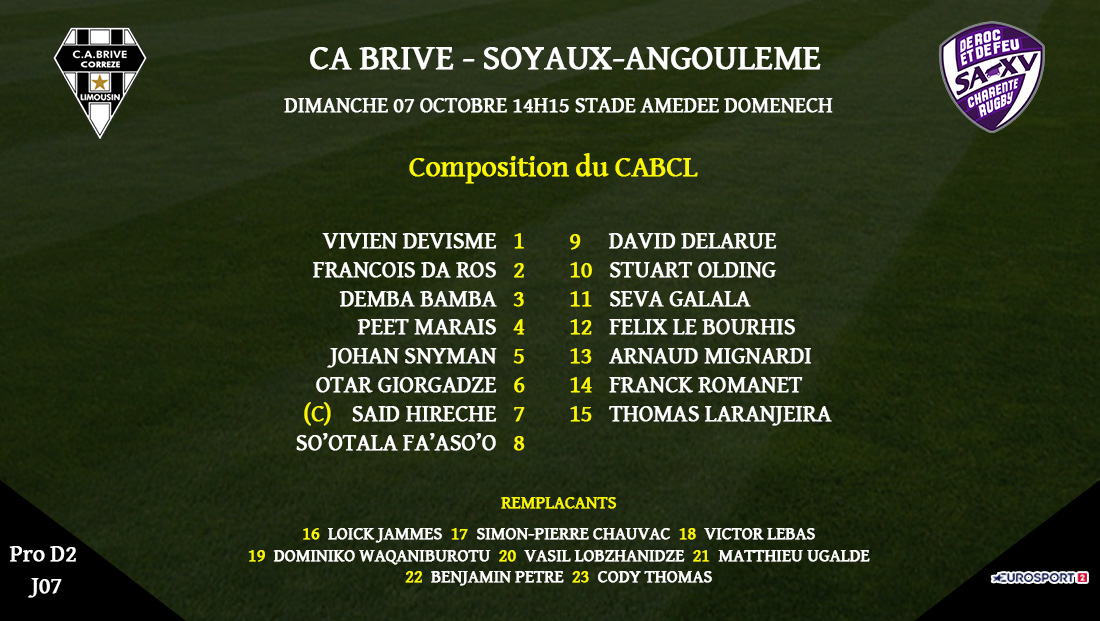 Pour cette réception, Brive fait seulement deux changements avec les titularisations d'Otar Giorgadze et Félix Le Bourhis. Notons toutefois la première apparition dans le groupe de Benjamin Pètre qui sera remplaçant au coup d'envoi.