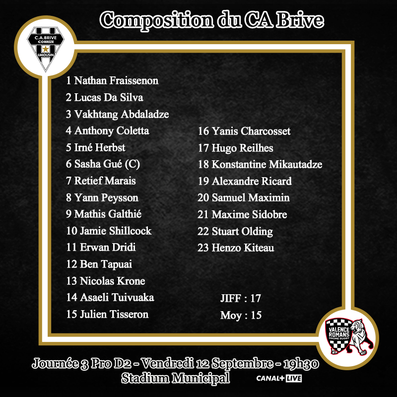 Voici le XV de départ du CA Brive pour la réception de Valence-Romans :