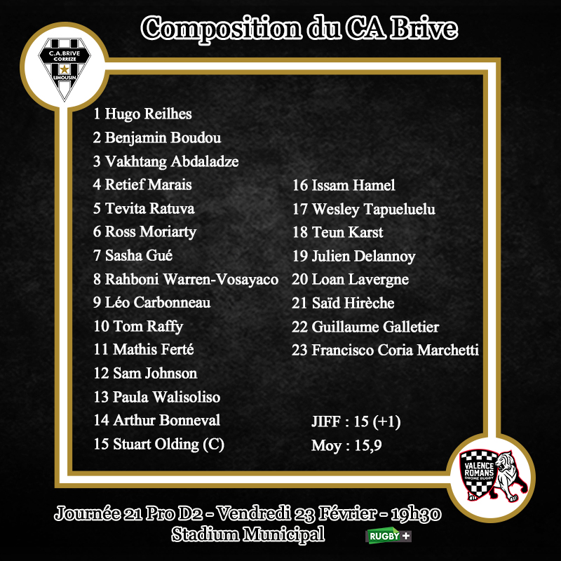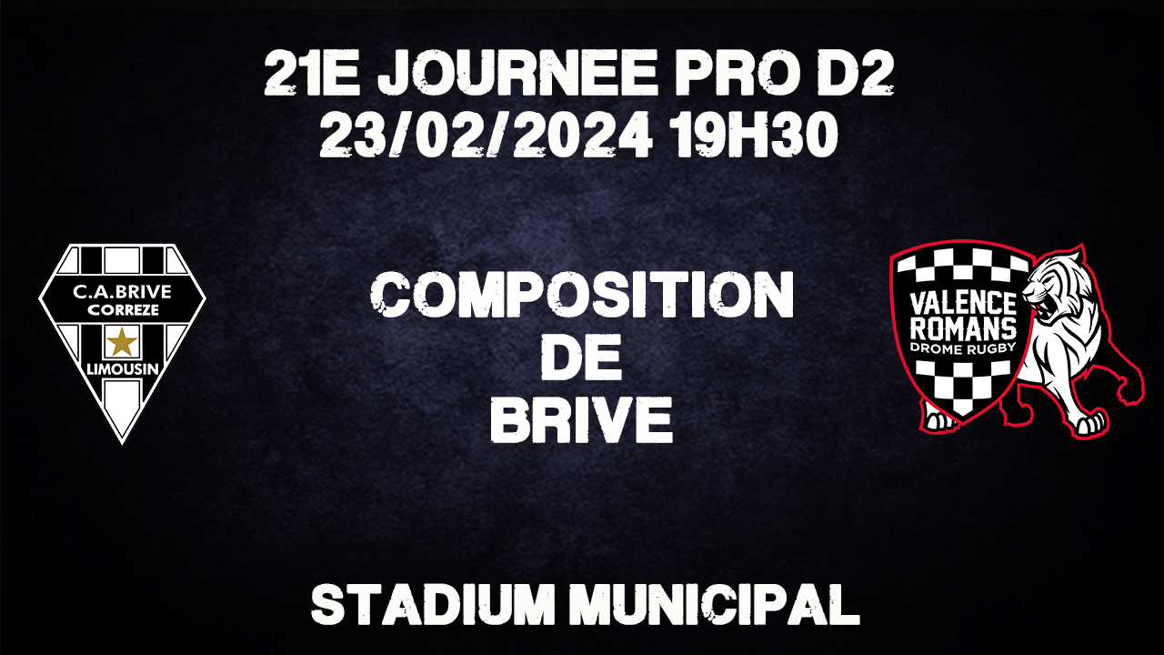Pour cette réception, Brive apporte de nombreux changements. Benjamin Boudou est titulaire au talonnage. Première titularisation depuis la réception de Rouen pour Vakhtang Abdaladze. Retief Marais est remis au poste de 2e ligne. Sasha Gué est de retour en 3e ligne. Retour de la charnière Léo Carbonneau - Tom Raffy. Mathis Ferté bascule à l'aile, laissant le poste d'arrière à Stuart Olding.