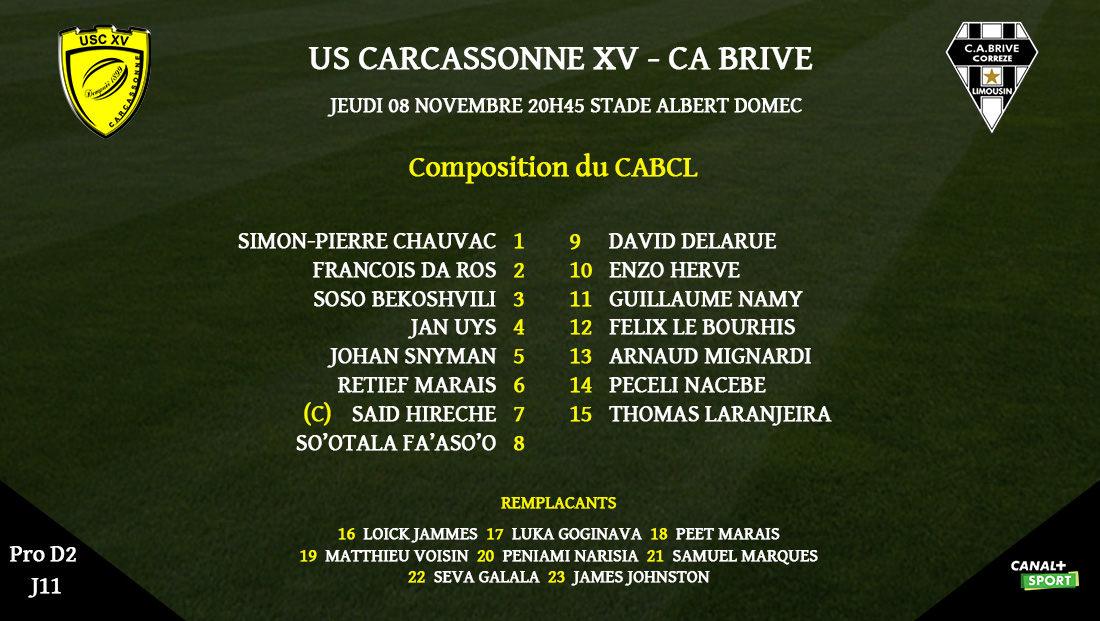 Voici le XV de départ du CA Brive pour le déplacement à Carcassonne :