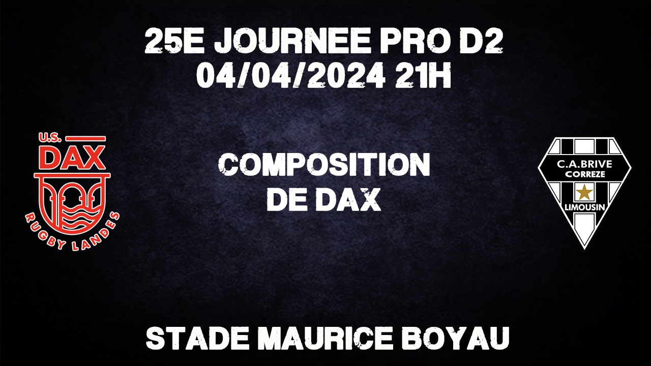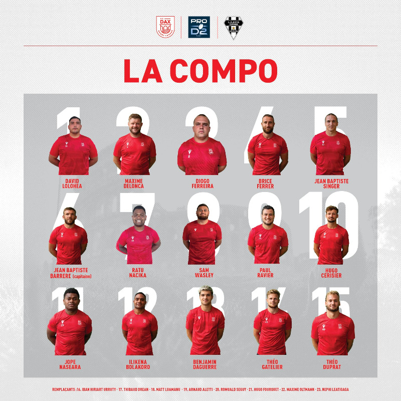 Pour cette réception, Dax ne peut compter sur Levi (genou), Dachary (cheville), Bidau (adducteurs), Asa (cheville), Mary (cheville), Lemalu (béquille), Garrouteigt (suspendu) et Reteau (suspendu).