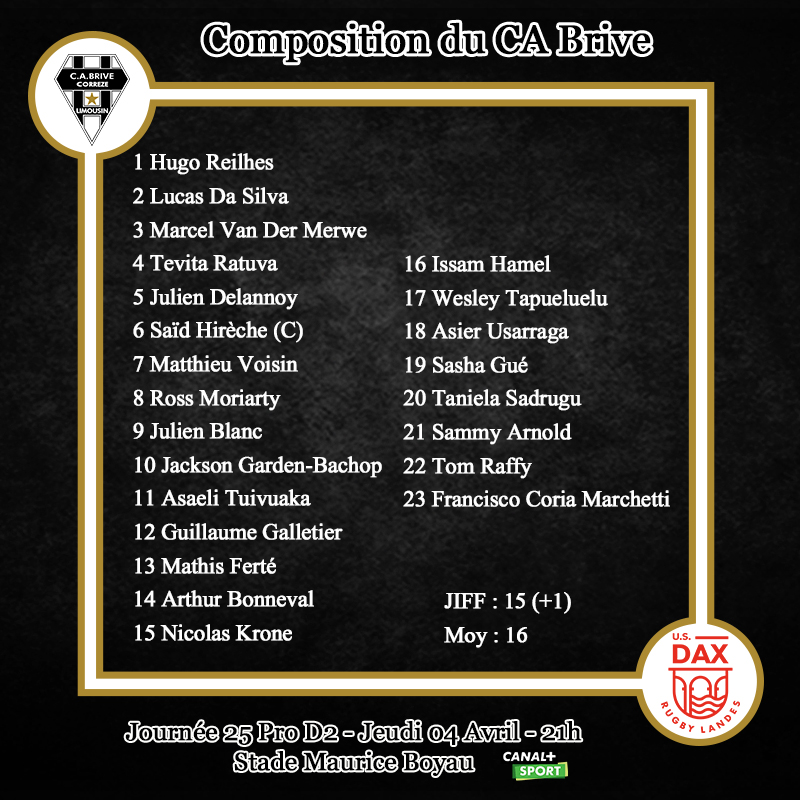 Pour ce déplacement, Brive poursuit ses rotations. Le pack est presque entièrement changé avec pas moins de 6 changements avec les titularisations de Hugo Reilhes, Lucas Da Silva, Marcel Van der Merwe, Julien Delannoy, Tevita Ratuva et Saïd Hirèche. La charnière évolue également avec Julien Blanc et Jackson Garden-Bachop. Guillaume Galletier est placé au centre. Arthur Bonneval est titulaire à l'aile.
