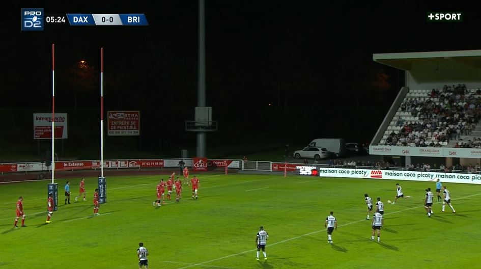 Le match démarre sur une période d'observation. Chaque équipe ne part pas comme une folle face à l'adversaire et cherche d'abord à se donner une bonne position d'attaque. Dax ne renie pas son style de jeu offensif et joueur mais pour cela, il faut conserver ses munitions et en touche, cela s'annonce compliqué avec un premier lancer volé par Matthieu Voisin (3'). Pour éviter de trop subir dans ce domaine, Dax joue rapidement une touche dans ses propres 22 mètres mais sur la relance, Hugo Cerisier s'enferme dans la défense briviste qui gagne la pénalité. Jackson Garden-Bachop ouvre le score (0-3, 6').