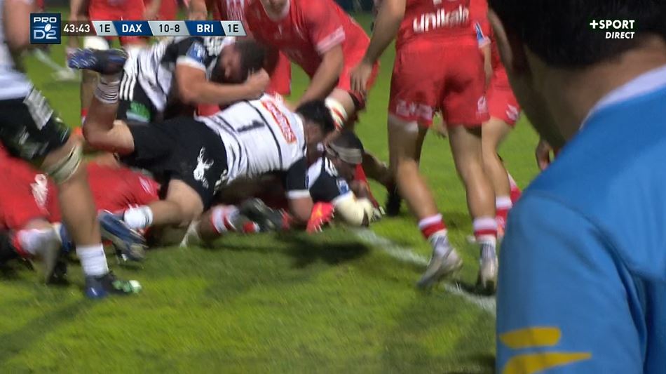 Brive attaque par le bon bout la seconde période. Brive est sur la ligne d'essai dacquoise mais sans la franchir. L'avantage ne donne rien alors l'arbitre revient à la pénalité. Le CAB opte pour la jouer à la main et on ne va pas tergiverser longtemps ! Asaeli Tuivuaka la joue pour lui-même, droit devant, en puissance et essai (10-10, 45').