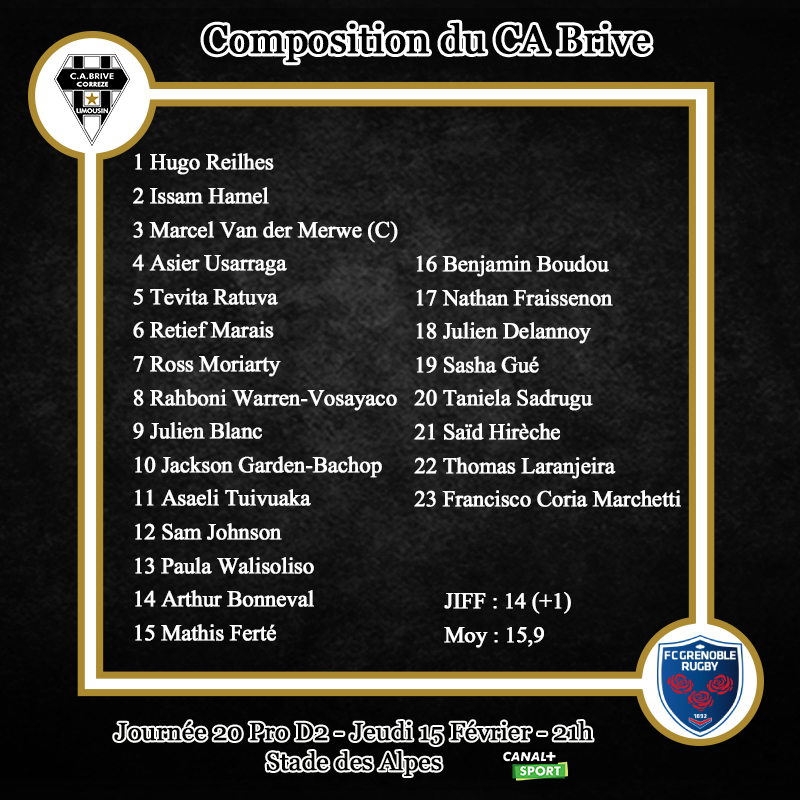 Voici le XV de départ du CA Brive pour le déplacement à Grenoble :