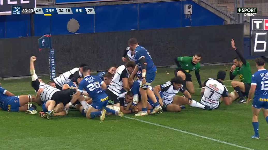 Brive continue sur sa lancée face à une équipe de Grenoble qui souffre de plus en plus depuis quelques minutes. Les brivistes ont une touche sur les 22 mètres grenoblois. Le maul s'enclenche à cette distance là et personne ne pourra le stopper. Hamel s'offre un doublé (34-22, 65')