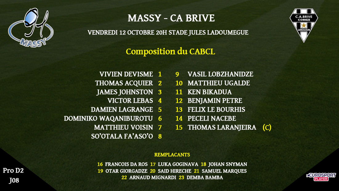 Voici le XV de départ du CA Brive pour le déplacement à Massy :