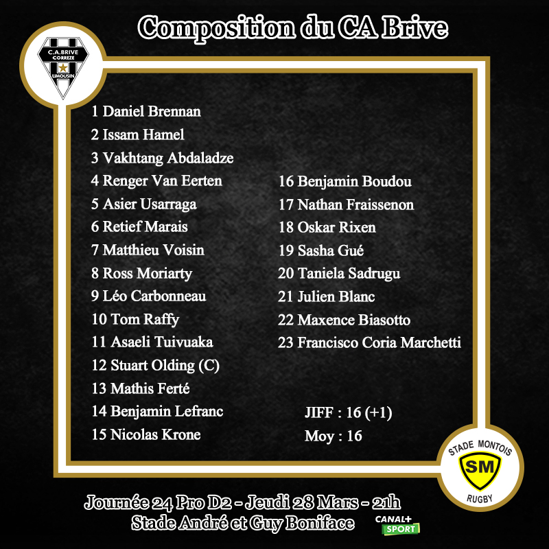 Voici le XV de départ du CA Brive pour le déplacement à Mont de Marsan :