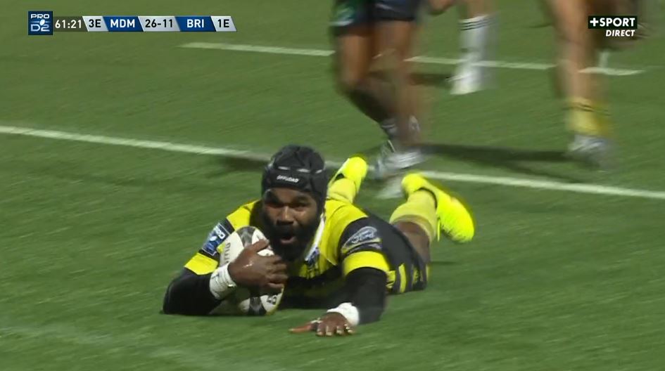 Mont de Marsan : 4 essais de Lagivala (10'), De Nardi (31'), Darquier (48') et Wakaya (63') ; 2 transformations (10', 63') et 3 pénalités (35', 40+1', 59') de Du Plessis