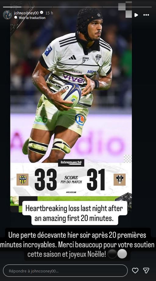 John Cooney affiche les deux sentiments qui ressortent à l'issue de ce match : la frustration d'échouer de si peu et la satisfaction de ce gros début de match. Il faudra corriger certaines choses pour pouvoir l'emporter à l'extérieur en 2026.