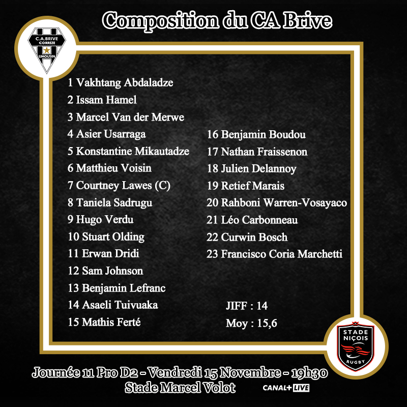 Voici le XV de départ du CA Brive pour le déplacement à Nice :