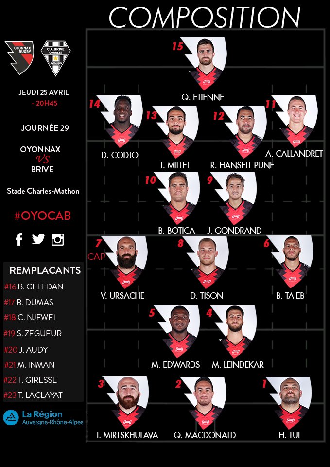 Voici le XV de départ d'Oyonnax pour la réception de Brive :