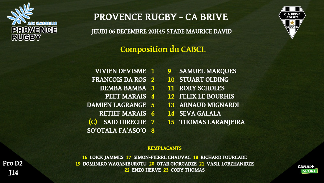 Voici le XV de départ du CA Brive pour le déplacement à Provence Rugby :