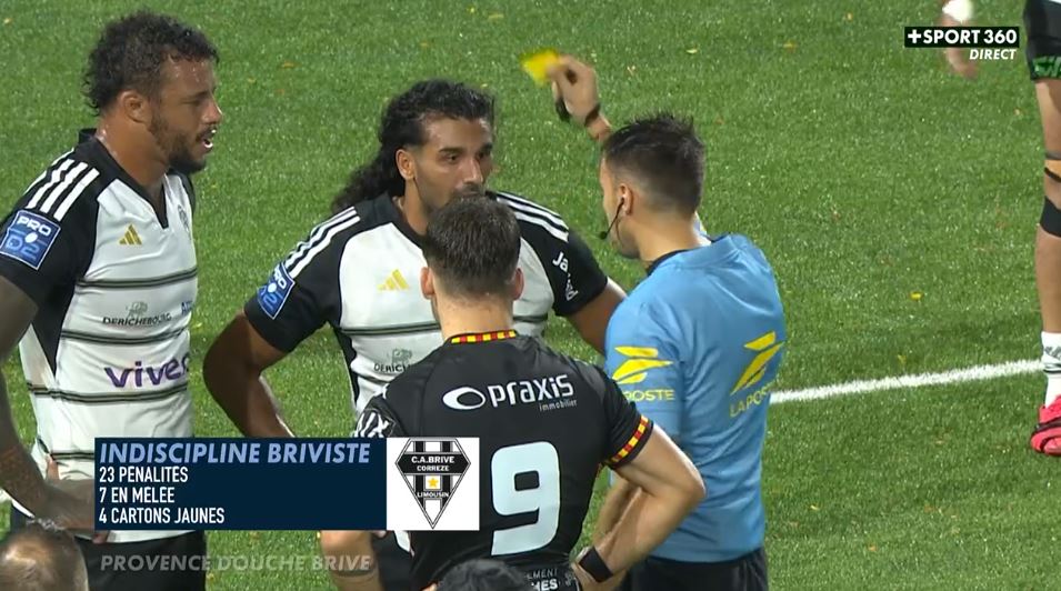 La discipline. Le match à Nevers avait atteint des sommets en terme d'indiscipline avec 34 pénalités dont 19 pour Brive. Pour ce match à Provence, on reste dans les mêmes eaux pour le total des fautes mais ça a bien augmenté du côté de Brive avec 23 pénalités et un total de 4 cartons jaunes. Il ne faut pas être un expert du rugby pour savoir que c'est impossible de gagner un match, aussi bien à domicile qu'à l'extérieur, en faisant autant de fautes et en prenant autant de cartons. Comment est-il possible de passer autant de temps à 13 ? Heureusement, Brive n'a pas craqué pendant cette période car la note aurait pu être salée au final. Le secteur de la mêlée a été particulièrement dans le viseur de l'arbitre avec pas moins de 7 pénalités contre les piliers brivistes. Le côté gauche a souffert, notamment en seconde période. Ce côté gauche entraine le dernier carton jaune, celui de trop qui va déclencher le réveil provençal dans les dix dernières minutes.