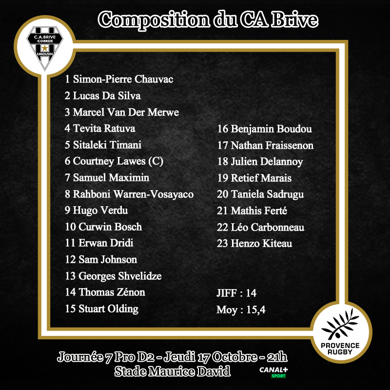 Voici le XV de départ du CA Brive pour le déplacement à Provence :