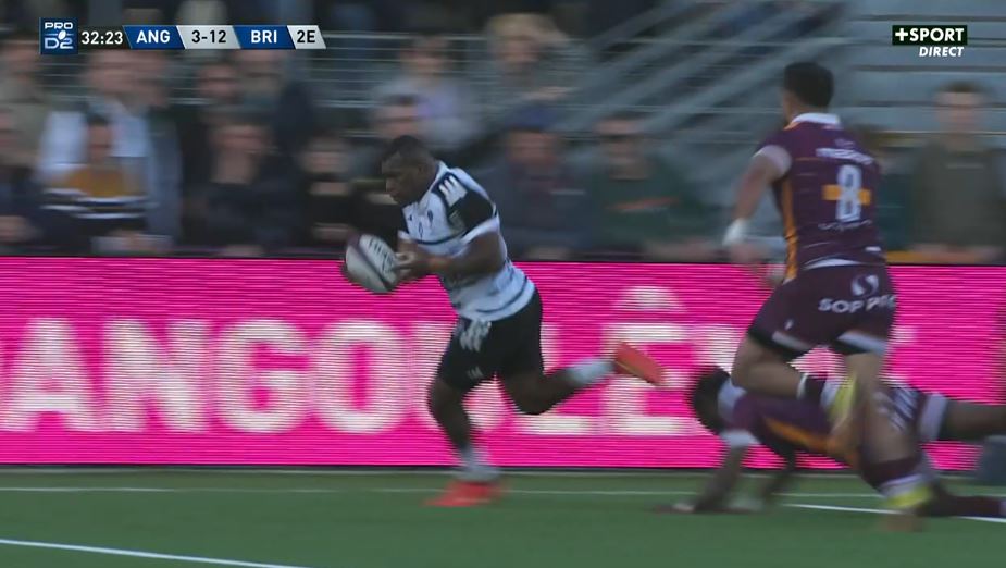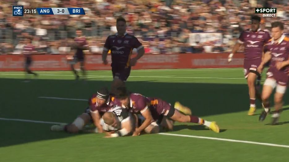 Contre le cours du jeu, Brive est devant mais cela ne freine pas vraiment les intentions angoumoisines. Si Brive est pénalisé et subit globalement les attaques, il peut aussi s'appuyer sur une très solide défense qui parvient à provoquer les pertes de balles de son adversaire qui ne parvient pas à remporter ses duels. Dans le combat, le CAB est supérieur actuellement, ce qui permet de s'offrir une bonne respiration. Après Boudou, c'est au tour de Nicolas Krone d'être récompensé pour son grattage. Sur la pénaltouche, le maul se forme mais ne progresse pas. Asaeli Tuivuaka se propose à l'intérieur et lancé. L'ailier pique à l'intérieur, crochète Matu'u, élimine Pierre Lafitte et s'en va marquer son essai en coin (3-12, 33').