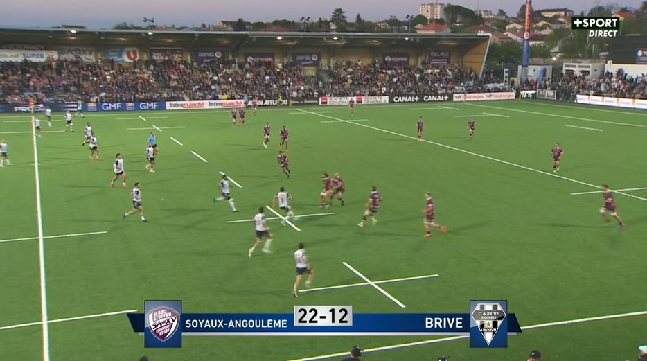 Le match a enfin débuté pour Soyaux-Angoulême qui ne s'arrête pas là. Les vagues reviennent et la défense briviste est dépassée. Pris dans l'axe, Brive subit les charges et recule à l'impact. Lafitte met le coup d'accélérateur avant que ses avants ne prennent la suite. Sur une dernière charge, c'est Maxence Lemardelet qui marque l'essai (13-12, 50'). Le staff briviste décide alors de changer le cours des choses en emportant de nombreux changements dans son pack. Brive retrouve un peu d'avancée mais Soyaux-Angoulême monte de plusieurs crans son intensité dans le jeu au sol et parvient à gratter plusieurs ballons. Brive est tout près d'exploser sur une nouvelle accélération des 3/4 angoumoisins. Barrett a un deux contre un à jouer avec Lafitte à sa gauche et avec Olding comme ultime défenseur. Mais l'ailier décide de partir intérieur et il est repris par les défenseurs brivistes. Soyaux-Angoulême manque une grosse occasion mais c'était sur un avantage. Botica ajoute malgré tout des points (16-12, 56'). Le CAB passe pour le moment totalement à côté de sa deuxième période. Mais tout est encore loin d'être joué. Les brivistes ont une pénaltouche à négocier à 5 mètres de l'en-but adverse mais Lucas Da Silva est coffré par la 2e ligne locale à quelques centimètres de la ligne (58'). Brive tente de relever la tête et de proposer du jeu. Mais une interception en bout de ligne inverse la pression. Dubecq joue au pied mais il est percuté par Tuivuaka. Carton jaune pour le briviste qui sera suspendu pour la réception d'Aurillac (61'). Botica ajoute trois points supplémentaires (19-12, 61'). Sikeli Nabou monte en puissance en cette 2e période et c'est toute la défense locale qui monte en puissance. Brive est à nouveau sur le point de craquer mais Dubecq commet un en-avant au moment d'aplatir (63'). La seconde période est très longue pour le CAB qui semble être resté au vestiaire à la pause. Les brivistes attaquent mais les avants angoumoisins sont bien plus présents dans le jeu au sol. Cependant, avec un écart au score de seulement 7 points, tout est encore possible alors qu'on entre dans le dernier quart d'heure. Brive plonge dans la bataille au sol mais plonge également en touche. Soyaux-Angoulême emploie la même tactique qu'à l'aller, c'est à dire n'avoir que 3 joueurs dans l'alignement, ne pas provoquer le maul et complètement perturber l'alignement briviste qui ne sait pas vraiment comment agir. En attaque, ce n'est pas mieux avec une mauvaise passe de Léo Carbonneau, directement dans les mains de Dubecq qui accélère mais est repris par Mathis Ferté (73'). Dans ces dernières minutes, le match s'affole un peu avec des attaques des deux côtés, pas forcément bien ordonées mais ça se répond du tac au tac. Sur un avantage en cours, Botica tente d'alerter Nabou, en position d'ailier, mais le 2e ligne est en manque de gaz pour récupérer cette transversale au pied. L'arbitre revient à la faute et Botica valide le succès des siens (22-12, 79'). Brive ne gagnera pas à Angoulême mais peut tout de même espérer gagner le bonus défensif avec un essai. Sur une mêlée, les avants font l'effort et obtiennent la pénalité. Ultime pénaltouche pour Brive. Lucas Da Silva tente d'alerter Sasha Gué mais le contre devine l'intention briviste la victoire est validée pour Soyaux-Angoulême. Les charentais ont donc confirmé leur succès à Agen en réalisant une grosse seconde période, remportée sur le score de 19 à 0. Brive n'a pas existé durant le second acte et la phase finale est désormais très lointaine.
