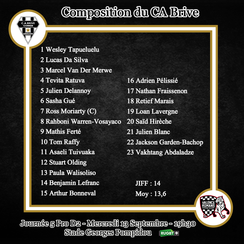Voici le XV de départ du CA Brive pour le déplacement à Valence Romans :