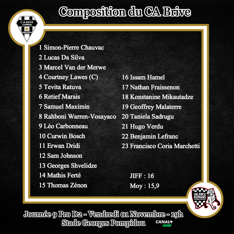 Voici le XV de départ du CA Brive pour le déplacement à Valence-Romans :