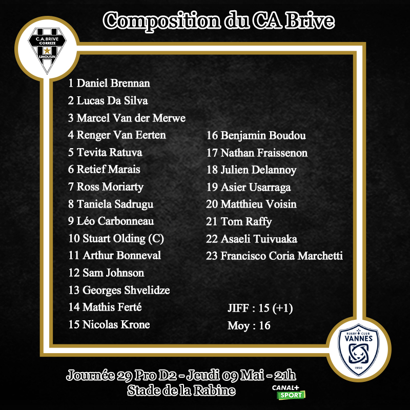 Voici le XV de départ du CA Brive pour le déplacement à Vannes :