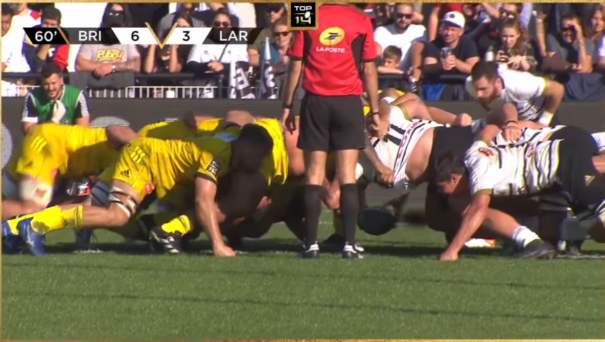 Mêlée introduction La Rochelle. Tawera Kerr-Barlow introduit en 2 temps le ballon, le ballon sort de la mêlée, il est écarté jusqu'à l'aile d'Arthur Retière qui marque en coin malgré le retour de Joris Jurand. Le public siffle et réclame la faute du demi de mêlée rochelais. Sauf que comme le montre la vidéo, l'introduction en 2 temps est provoquée par une faute briviste.