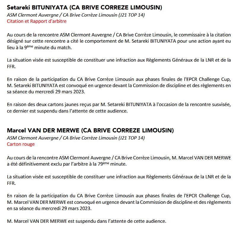Pour ces deux actions, Setareki Bituniyata et Marcel Van Der Merwe sont convoqués en commission de discipline. Mais compte tenu que Brive dispute un match de Challenge Cup vendredi, l'audition est avancée d'une semaine et aura lieu ce mercredi 29 mars.