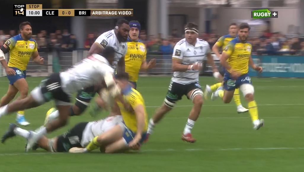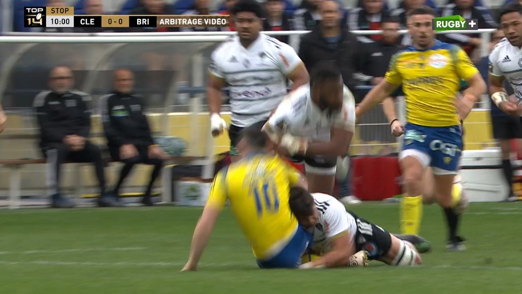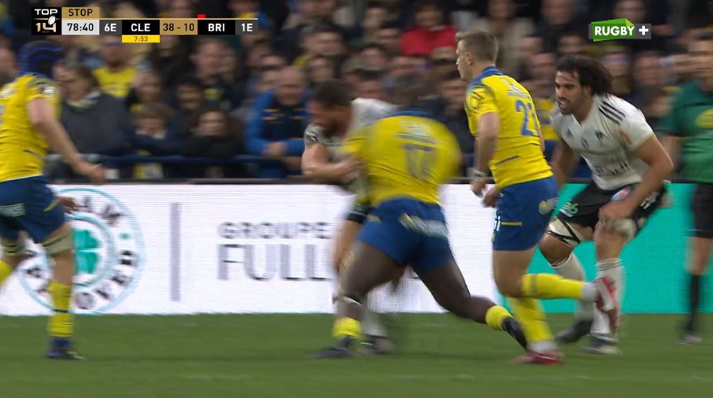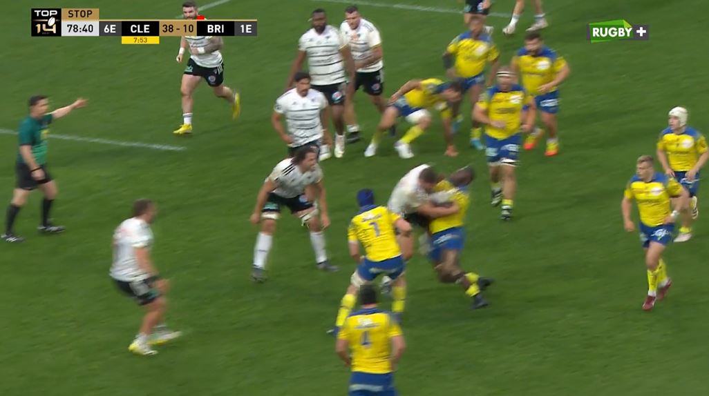 Pour le deuxième carton rouge, Marcel Van Der Merwe charge à l'épaule Daniel Bibi Biziwu et l'épaule du pilier briviste vient à la tête du pilier clermontois. Geste non maitrisé, plein de frustation et totalement inutile à ce moment de la partie.