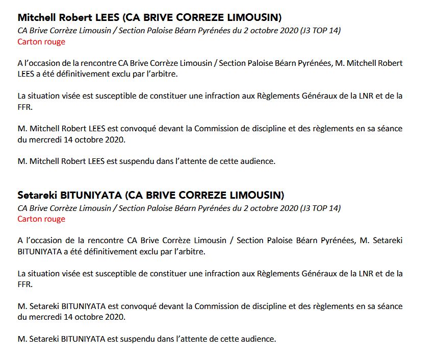 En conséquent, Lees et Bituniyata sont suspendus pour le déplacement de Brive à Castres et ils connaitront la durée de la suspension mercredi 14 octobre.