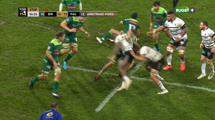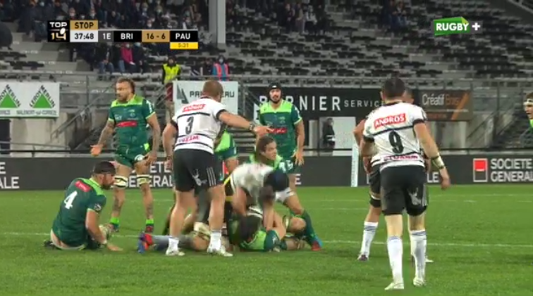 Un peu avant l'heure de jeu, c'est au tour de Setareki Bituniyata de rejoindre les vestiaires avant les autres. Voulant plaquer Pierrick Gunther, l'ailier briviste ne se baisse pas et c'est un plaquage à l'épaule, l'épaule touchant le visage du 3e ligne palois. Après vidéo, carton rouge.