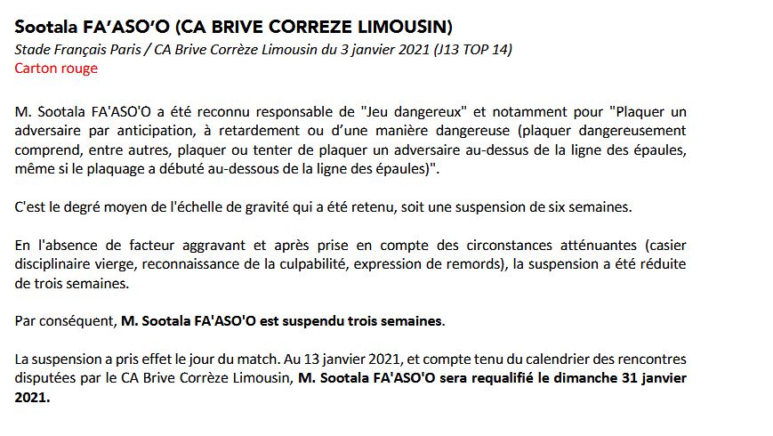 Pour son premier match de 2021, Brive est en déplacement au Stade Français. Après un mauvais début de match, le CAB fait son retour et recolle au Stade Français en début de seconde période. Alors que le score est de 30 à 21 pour Paris, sur la même action, Brive encaisse un essai et récolte un carton rouge. Ce carton est pour So'otala Fa'aso'o pour un plaquage dangereux sur Joris Segonds, l'ouvreur du Stade Français.