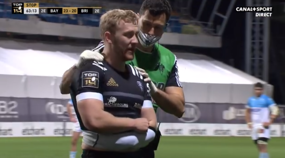 Remplaçant, il entre en jeu à la 55e minute sur le terrain de Bayonne. Moins de dix minutes plus tard, il doit quitter ses coéquipiers, le bras gauche en écharpe. Cette image rappelle celle de Soso Bekoshvili, blessé à Castres la saison dernière. Jeremy Davidson craignait une fracture et malheureusement, c'est bien le cas.