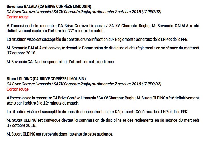 Olding et Galala manqueront le déplacement à Massy ainsi qu'une partie du troisième bloc du CAB. Reste à savoir combien de matchs écoperont les deux joueurs brivistes. Rendez vous la semaine prochaine.