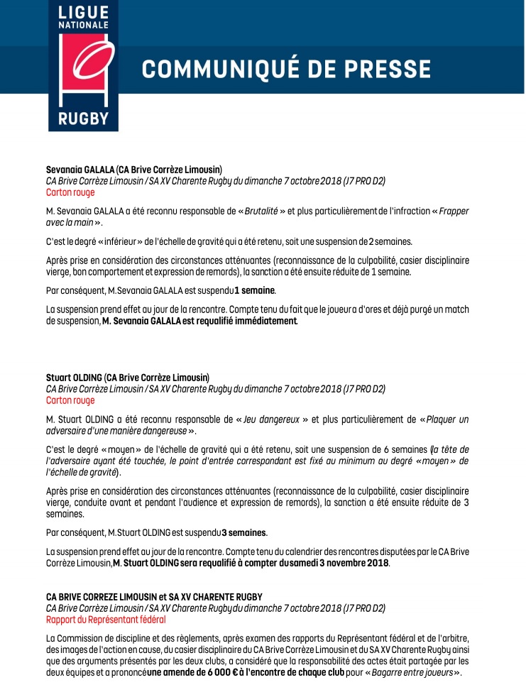 Si Brive l'avait emporté face à Angoulême en montrant une grande force de caractère, il a aussi payé en perdant deux joueurs, expulsés pendant la rencontre : Stuart Olding et Seva Galala. Suspendus à Massy en attente de leur passage devant la commission de discipline, les deux joueurs savent à quelle sauce ils sont mangés.