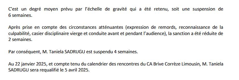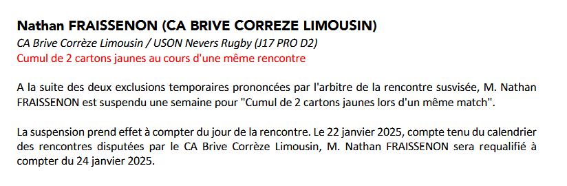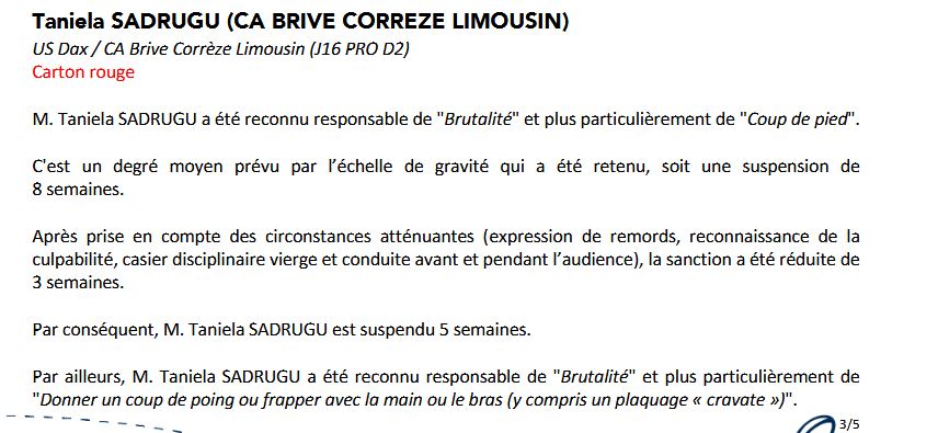 Jusqu'à présent, seul Thomas Laranjeira était passé en commission de discipline et avait écopé de 4 matchs de suspension. Cette fois-ci, ce n'est pas un mais deux joueurs brivistes qui passaient devant la commission de discipline. Taniela Sadrugu a pris un carton rouge pour un coup de pied sur un joueur au sol lors du déplacement à Dax. Nathan Fraissenon a pris un double carton jaune la semaine dernière face à Nevers.