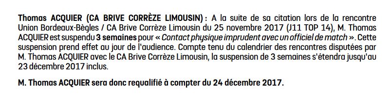 Deuxième passage de suite devant la commission de discipline de la LNR pour Brive. Après un premier passage qui a vu Félix Le Bourhis être suspendu 3 matchs et Mike Tadjer 1 match, c'est autour de Thomas Acquier d'être jugé.