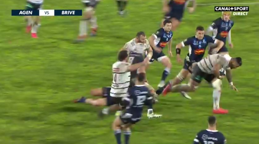 Le numéro 8 casse le plaquage sur les 45 mètres et accélère jusqu'aux 22 mètres. Les relais s'enchainent avec Muller qui tente de se défaire de la défense agenaise. On multiplie les temps de jeu mais la progression est stoppée. Après avoir reculé, c'est au tour de Blanc de franchir le rideau et de remettre tout le monde dans l'avancée. Valentin Tirefort se fait plaquer haut. Tandis que l'ailier sort pour un protocole commotion, Laranjeira remet Brive devant au score (3-6, 30'). Le CAB tente de faire un peu de jeu mais sans toutefois prendre de gros risques. On préfère occuper au pied et attendre la faute agenaise. Juste avant la mi-temps, Brive se fait sanctionner au milieu de terrain. A plus de 50 mètres, Verdu la tente mais la rate totalement et Brive peut se dégager. Le dernier ballon sera agenais mais ce sera un ballon perdu, tapé en touche par Blanc. La partie est cadenassée à double tour et les équipes limitent les risques offensives. A ce petit jeu de gagne-terrain, c'est Brive qui mène à la pause 6 à 3.