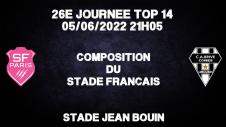 Pour le Stade Français : 1 Castets - 2 Panis - 3 Roelofse - 4 Gabrillagues (Cap) - 5 Maestri - 6 De Giovanni - 7 Kremer - 8 Macalou - 9 Hall - 10 Barré - 11 Lapègue - 12 Arrate - 13 Glover - 14 Veainu - 15 Hamdaoui
