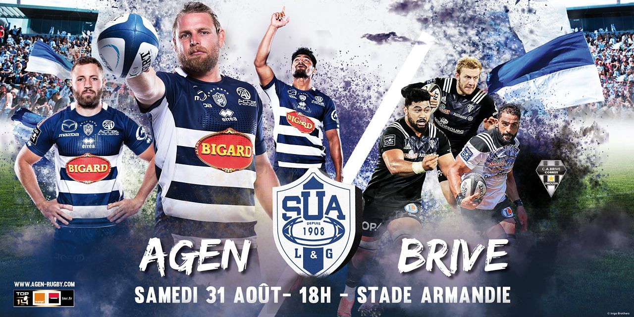 Agen va s'appuyer sur un pack expérimenté qui a l'habitude de jouer ensemble. Autour du capitaine Marc Barthomeuf, Malino Vanaï découvre le Top 14 après avoir connu la Pro D2 durant 4 saisons à Montauban. Le colombien Andres Zafra a été une belle découverte la saison dernière et la doublette avec Tom Murday risque de poser problème à l'alignement briviste. La puissance de l'ancien montois Lawrence Pearce a fait des dégâts en Pro D2 et devrait en faire en Top 14. De retour au club, Raphaël Lagarde va amener toute son expérience. La ligne de 3/4 est explosive avec un ancien du CAB, Benito Masilevu. Johan Sadie est en forme et il avait marqué un essai lors de la dernière venue de Brive à Armandie. Mathieu Lamoulie est un cadre du SUA et le titulaire au poste d'arrière, lui qui a débuté avec Agen il y a presque 10 ans.