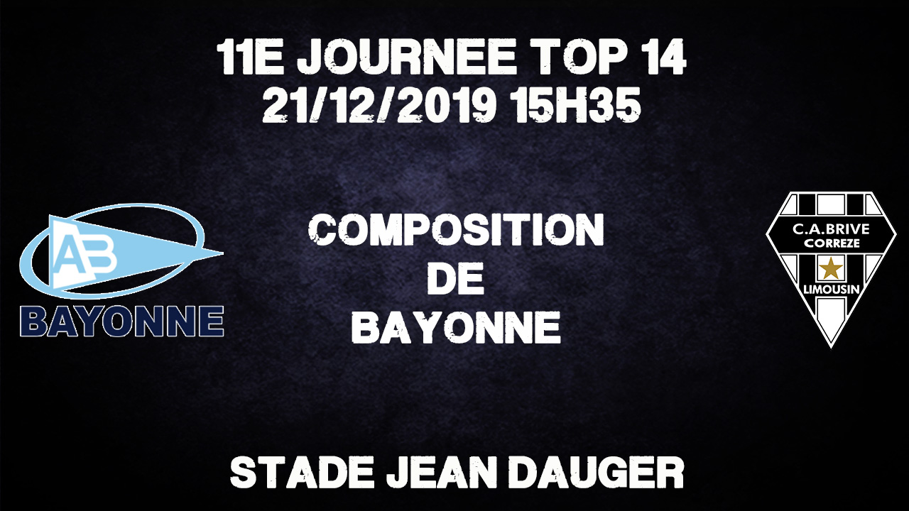 Pour cette réception, Bayonne est privé de Luamanu et Taofifenua (suspension), Battut (biceps), Gorin (genou), Jaulhac (genou), Delonca et Galarza (oreillons).