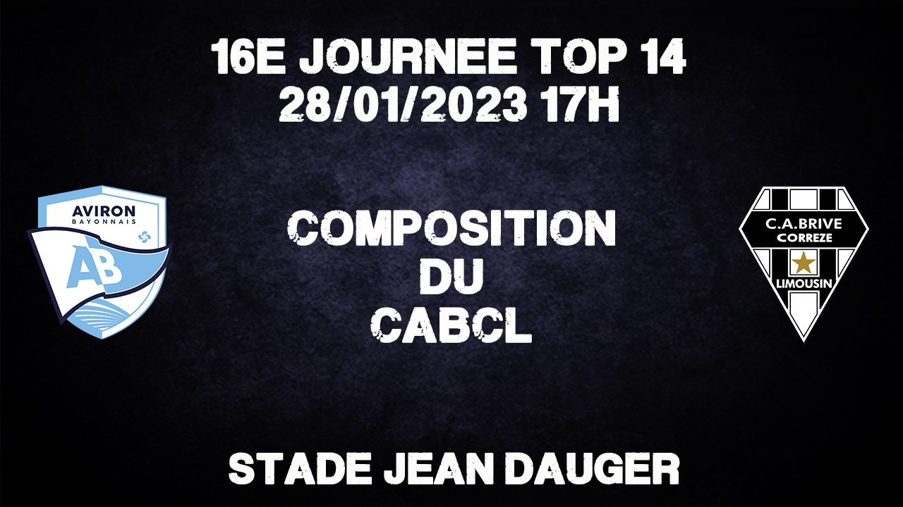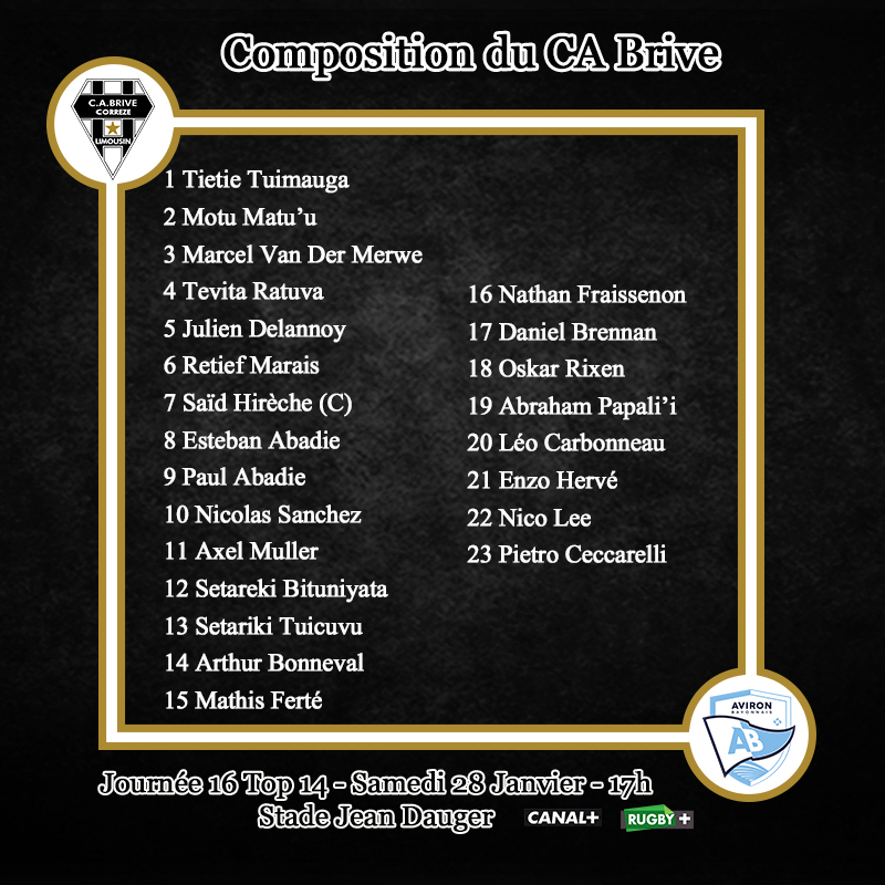 Pour ce déplacement, Brive garde l'ossature du match contre Cardiff avec quelques ajustements. Tietie Tuimauga connait sa première apparition et titularisation en Top 14. Marcel Van Der Merwe est titulaire au poste de pilier droit. Tevita Ratuva retrouve sa place en 2e ligne. Tandis que Retief Marais glisse à l'aile, Esteban Abadie est en numéro 8. Paul Abadie et Enzo Hervé forment la charnière. Axel Muller est à l'aile tandis qu'on conserve la même paire de centres : Setareki Bituniyata - Setariki Tuicuvu. Deuxième match comme titulaire mais premier en Top 14 avec le CAB pour Arthur Bonneval.