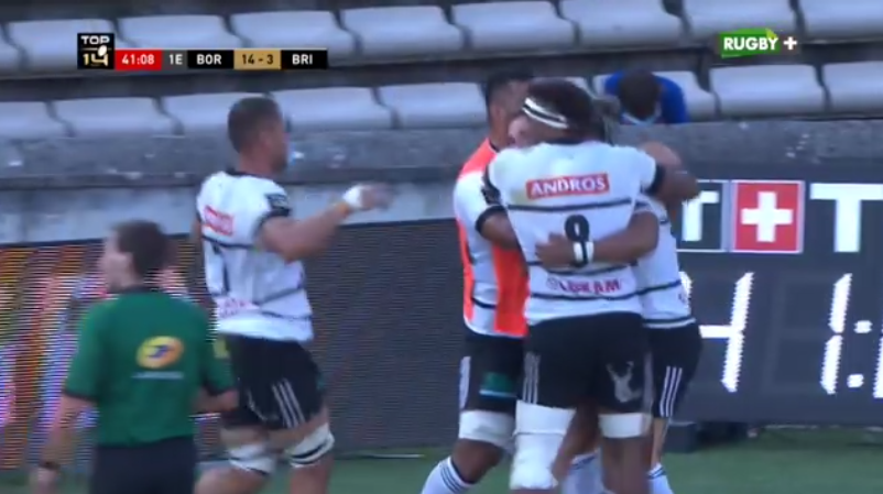 14-8 à la pause. Bordeaux accélère en début de seconde période. Jalibert lit parfaitement la défense briviste, Santiago Cordero appuie sur l'accélérateur.