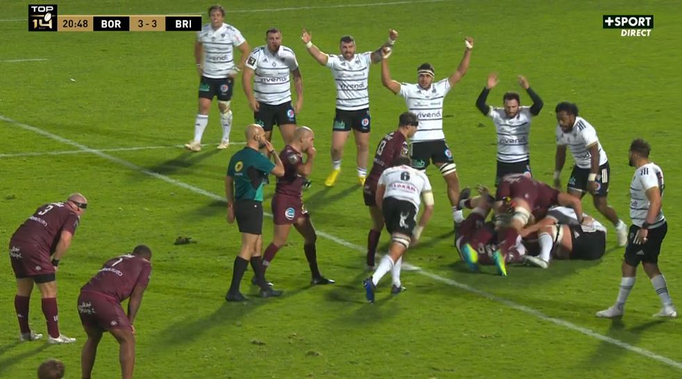 L'engagement défensif. Du côté de Pau, Arnaud Méla n'avait pas apprécié l'état d'esprit affiché par l'équipe. L'entraineur briviste attendait bien autre chose à Bordeaux. Dans un plan de jeu restrictif ou défensif (comme vous voulez), Brive a été solide en défense pendant presque une heure avant de craquer. Saïd Hirèche n'a pas mis longtemps avant de signaler son retour au jeu en grattant deux ballons au sol. Défensivement, le CAB a laissé peu d'espaces aux bordelais qui ont multiplié les attaques sans réellement trouver les décalages et les surnombres. Il a fallu finalement attendre les infériorités numériques pour voir Bordeaux concrétiser ses attaques. Mené de 7 points à la pause, Brive était dans son plan de jeu et espérait l'amener le plus loin possible pour tenter à ce moment là de sortir et concrétiser quelques actions qui auraient pu rapporter un point ou plus. En tout, Brive a réussi 177 plaquages, en manquant 48 mais seulement 8 franchissements concédés. 7 joueurs ont franchi la barre des 10 plaquages avec un parfait 14/14 pour Saïd Hirèche et 18/19 pour Esteban Abadie. L'engagement a été bon mais n'a pas tenu jusqu'à la fin et surtout, il a manqué beaucoup d'autres choses pour ramener un résultat de Bordeaux.
