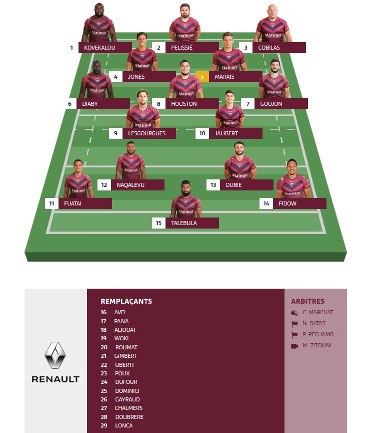Pour cette réception, Bordeaux a beaucoup d'absents : Rey (genou), Schoeman (machoire), Connor (cheville), Tauleigne (commotion), Domvo (cheville), Decron (genou), Braid (pied), Maynadier (cervicales), Hickey (genou), Cros, Clerc (suspendu), Poirot, Taofifenua, Serin (XV de France), Tabidze (Géorgie). Ducuing est au repos.